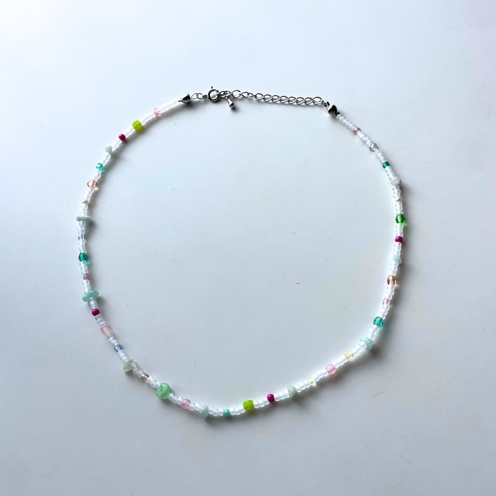 ホワイトのシードビーズをベースに、ひとつひとつ異なるビーズをアクセントに加え、唯一無二のデザインに仕上げました。